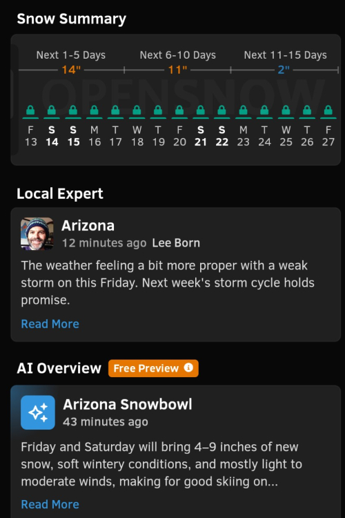 Day 42 and all the lifts were working. Amazing. Not as crowded as expected for Presidents' weekend. I guess all the Canadians are celebrating their Family Day by staying out of the US. PXL_20260213_201707484~2.mp4 PXL_20260213_195135594.mp4