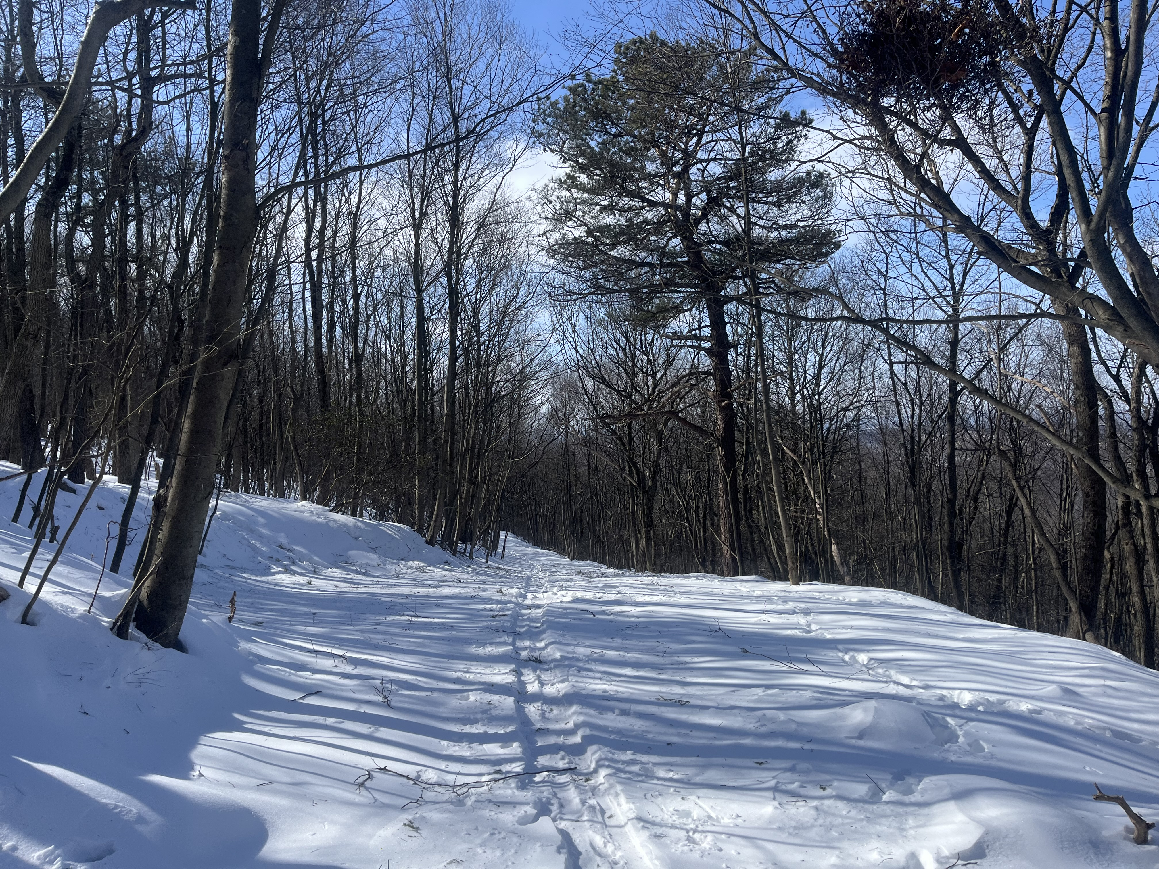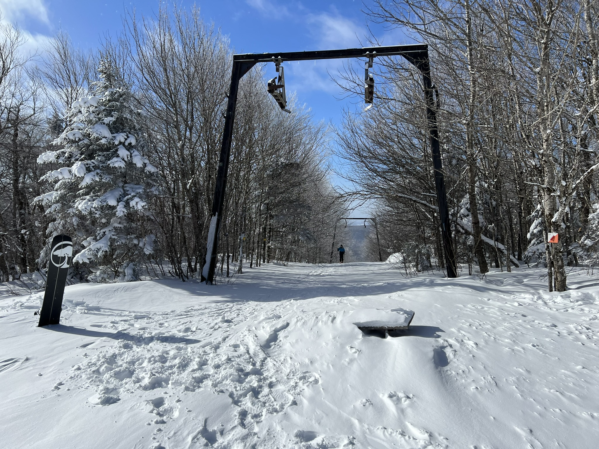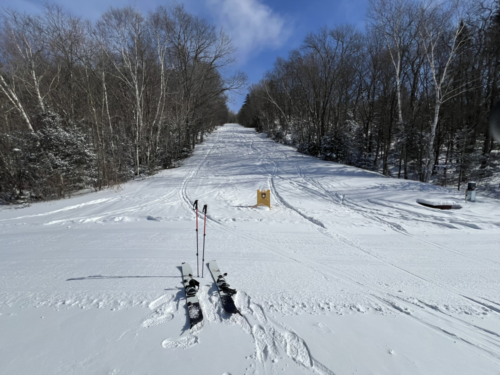 Too cold for lifts today so uphill is the game. Visited Prospect Mountain nordic center outside Bennington. This used to be an alpine and nordic ski area but the alpine ski area closed in the 1991. The trails are still maintained for alpine touring and cross country skiing. Temp was -4F pulling into the parking lot. About a dozen other cars were there at noon. An all day pass for alpine touring or cross country costs $25. The main skin track is straight up the old T-bar line. Prospect is not steep, and it's an easy skin up to the top. Someone in the lodge said they'd been getting 1-3 inches of orographic lift produced snowfall a lot of nights over the last few weeks. They got maybe 3-4 inches last night. There was one other set of fresh tracks up today and one guy followed me up. Most of the trails have filled back in after the last major snowfall and are about knee deep in very light powder. The mountain was, for all intents and purposes, untracked this morning with a couple of exceptions like the lift line. It was very easy to find routes down with a completely pristine powder surface. This was probably the best day of snowboarding I've ever had. Did not feel the temps for the most part. The air was dry and there wasn't too much wind. Had a hot drink and some chili in the lodge before heading out. Absolute 10/10 day.9 points