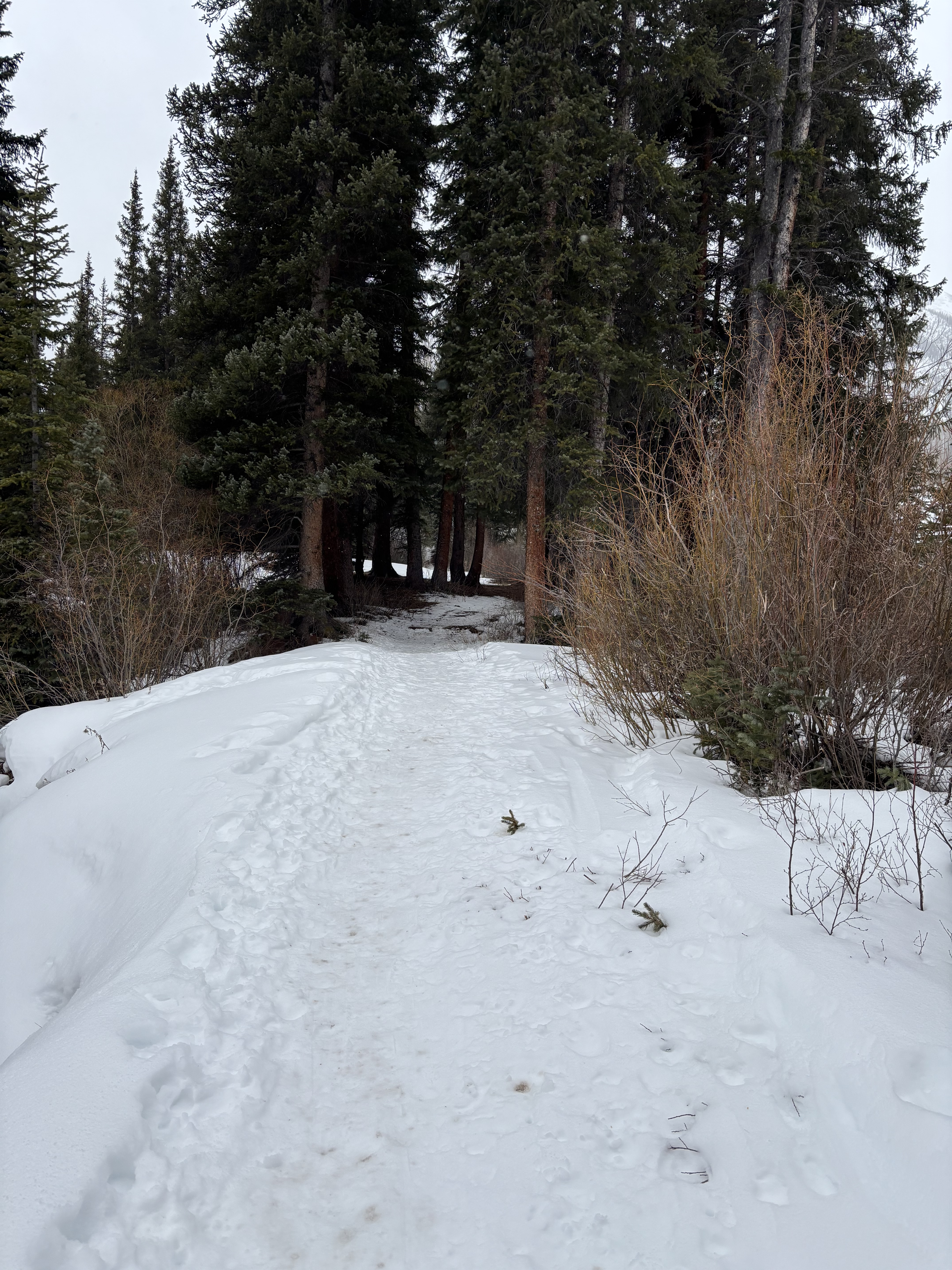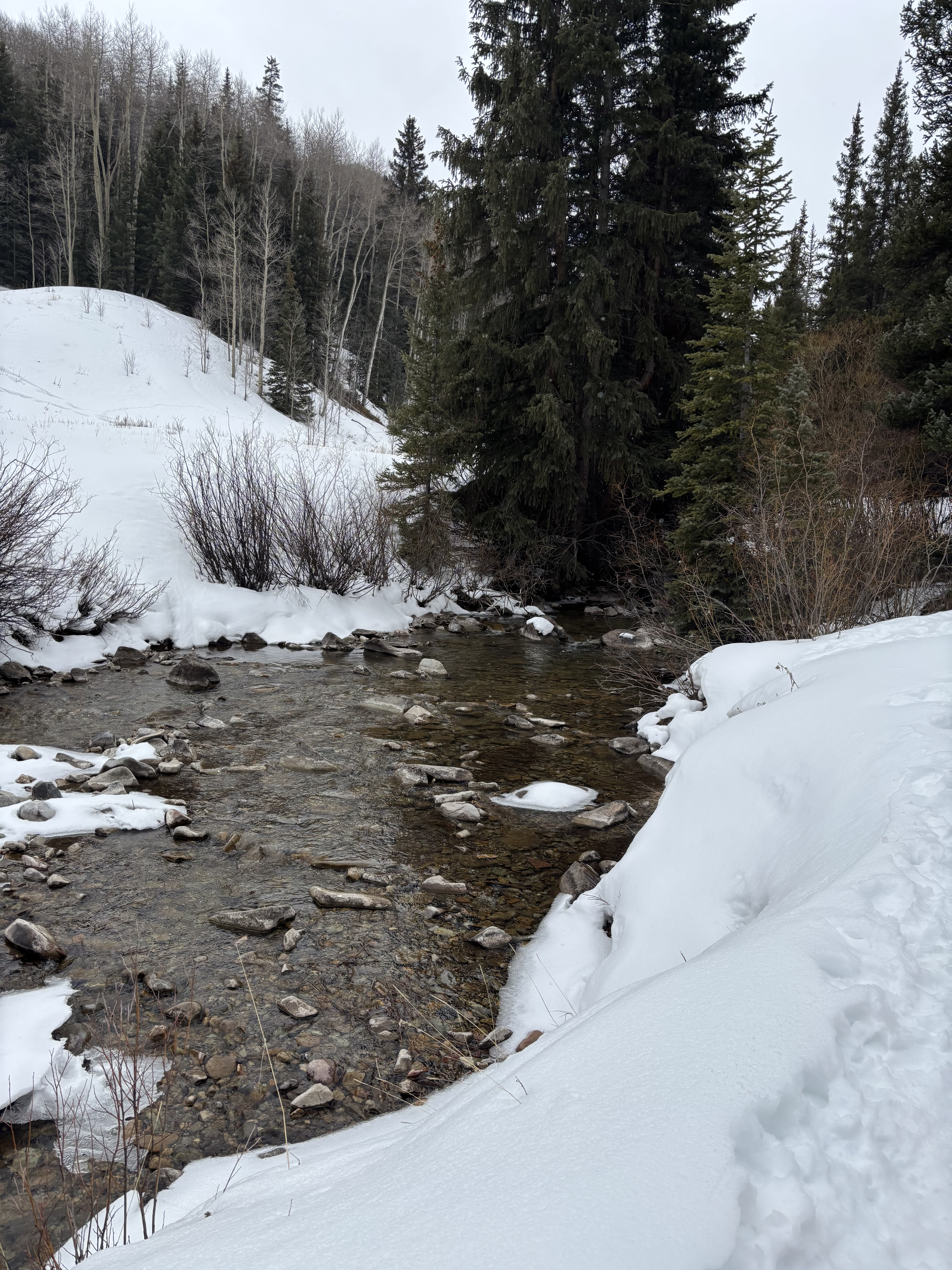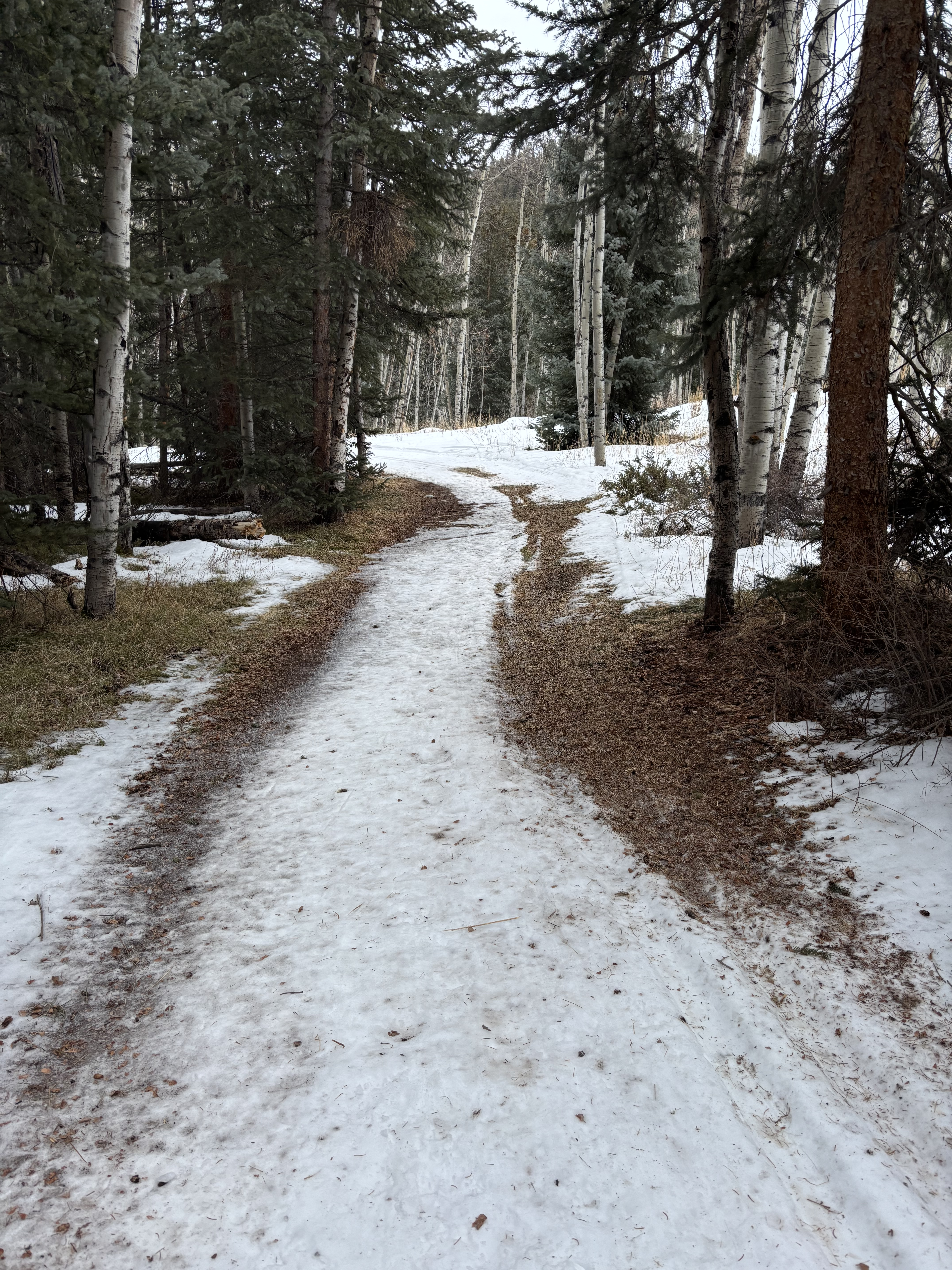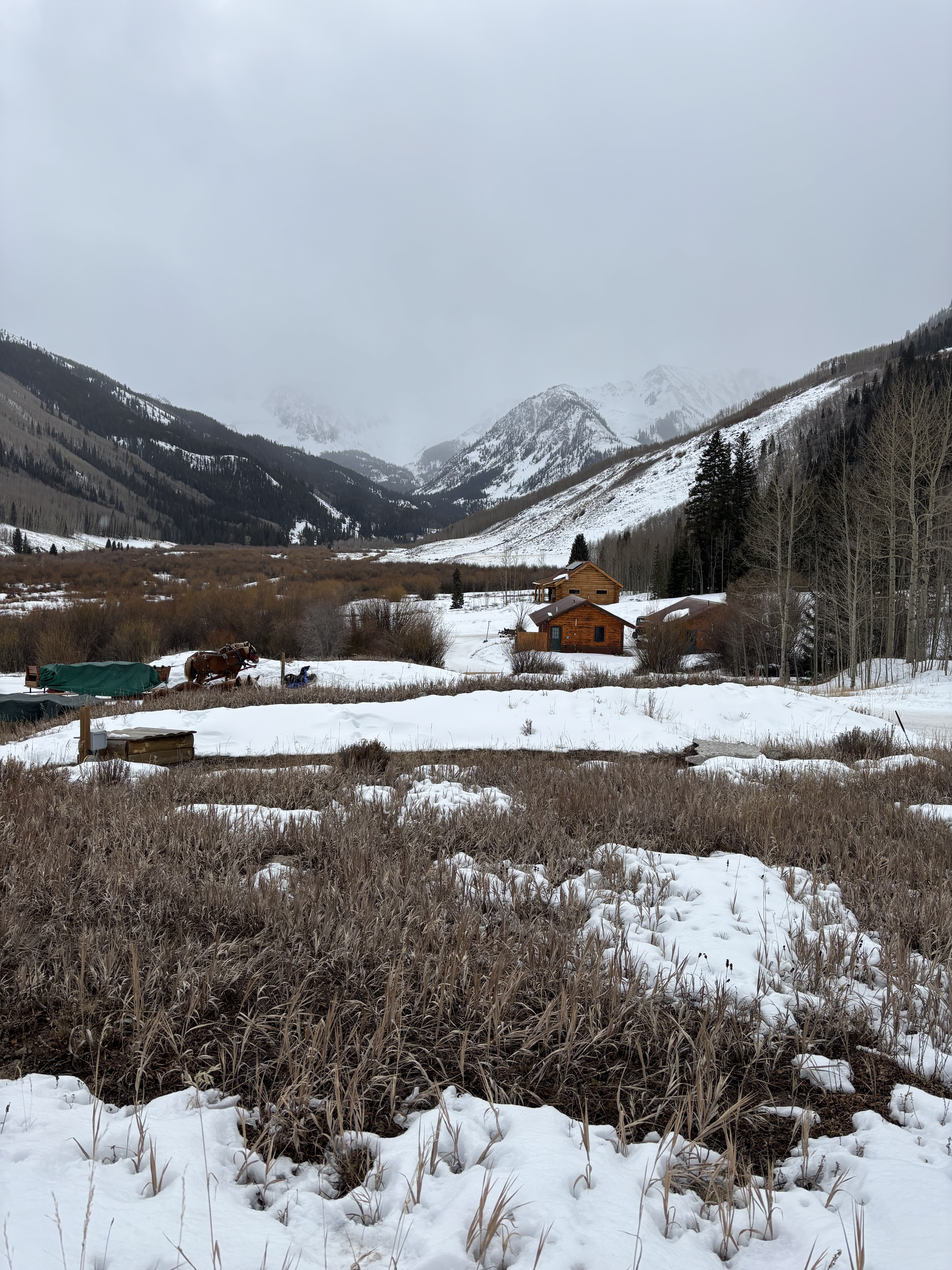 Snow is finally just starting to fall here at 2:44pm. It was raining this morning! I checked out Ashcroft Nordic ski area near Aspen. When I called to ask trail conditions he said I may have to remove my skis and walk over “some” sections. In the first 3/4 mile I think I had to take my skis off 7 times to walk over dirt. sections like this I kept skis on and carefully walked over the dirt staying on the snow. I did a 3 mile loop. First section kept you next to the river and in the trees. If there was more snow it would have been really scenic. once out of the trees the wind picked up a lot. Signage was not great but finally found my return trail. There is a fancy schmancy restaurant at the turn around point that people get shuttled in by horse and carriage if they don’t want to ski or snowshoe The first section of the return was some more walking but then I was able to keep skis on and dodge the obstacles. It wasn’t steep but you would be surprised how fast you can gain speed on Nordic skis with solid sheets of ice. Lots of terrifying snow plows wondering if I would stop in time to miss the next rock. It would be a fun place to go back when there is more snow.4 points