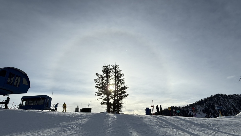 Well, I don’t know what those white things up in the sky blocking the bluebird day are, but hopefully they contain something good! Took the later bus to help break this Groundhog Day routine and shake things up a bit. Arrived at the mountain to 29 degrees and a noticeable humidity bite to the cold. Full-on high-speed groomers so that I could get 10 runs by 9, then moved onto other lifts. Everyone is waiting with bated breath at the hope of some snow this week, as more and more rocks are showing through every day. It was 38’ when I left the mountain. This is one of those California Dream days: Ski in the morning and walk around the neighborhood in 62’, shorts and short sleeves. Crazy!!4 points