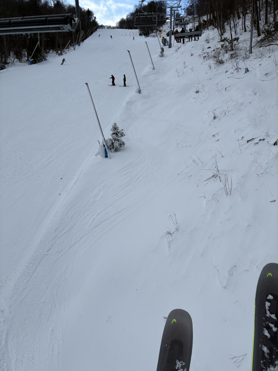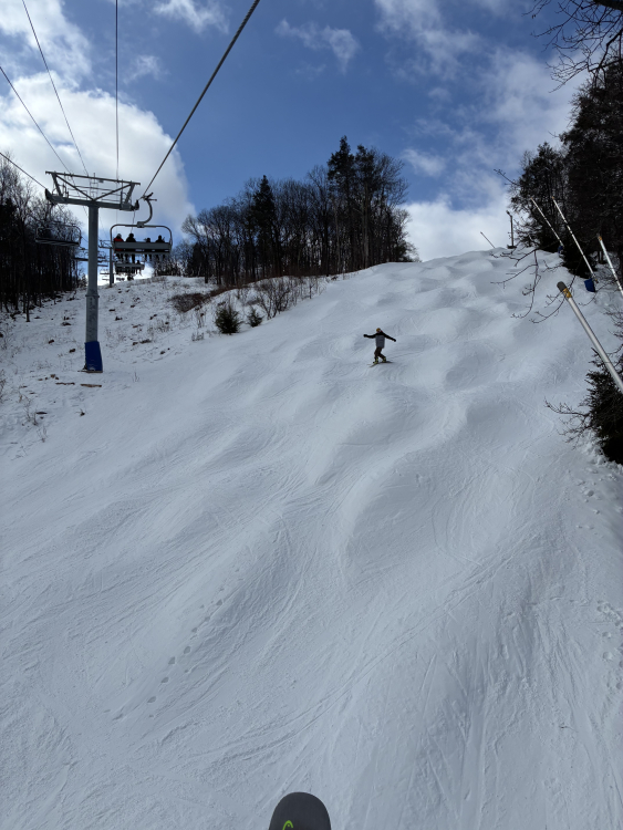 Hey All, I’m back from a fun day at Blue mountain the true mountain. I arrived at the lower lot before 720am and it was in the mid 20s under partly sunny skies. In the house was everybody except BenM, Mixilplix, Root, Angryhugo and Zonked. I overdressed so when I went in to pee I dropped a layer and stuck my green fleece on top of the lockers…something I’ve never done but I’m a progressive guy. I think their civilian OG six pack cause my gate was slow to open and first run on Challenge which was not very good…some slick and crunchy as they must have blown some elephant snot on it overnight. Switchback was OK, some smooth some crunchies, lazy Mile I found to be pretty nice along with coming soon early. Main Street was ok…midway was small cookies and Paradise was pretty nice. I mostly skied with Airhead and SaltyAnt wow salty is a pole planting pro…I was in awe just watching. Crowds were moderate to heavy, no real liftlines while I was skiing but with all three high speeds running the trails were quite crowded. I went on sidewinder once and it wasn’t that good..that run gets so much traffic and people throw their skis sideways a lot due to all the roof rollers that it goes to shit fast. Nightmare Dreamweaver is now a terrain park and I finished my session with a paraweaver and Dreamweaver had pretty icy and chunky snow. Skiing overall was ok to good and the parking lot was fun and with the warm weather I hung out in the lot way longer than I skied and prob have sunburn..When I left around 130ish there were a shit ton of people and I had to be aggressive to get out of the lot in a timely fashion with all the people across the street… Ski most of you tomorrow JADIP10 points